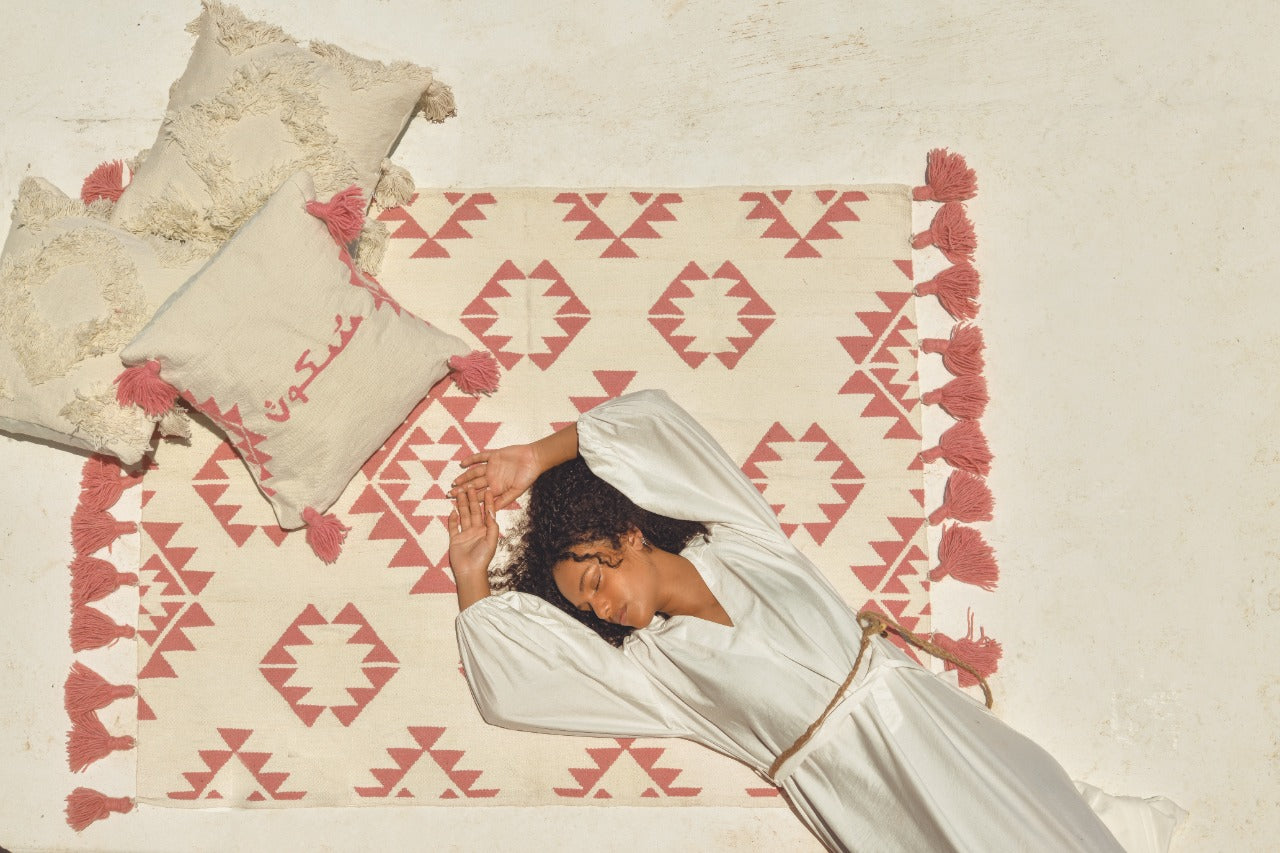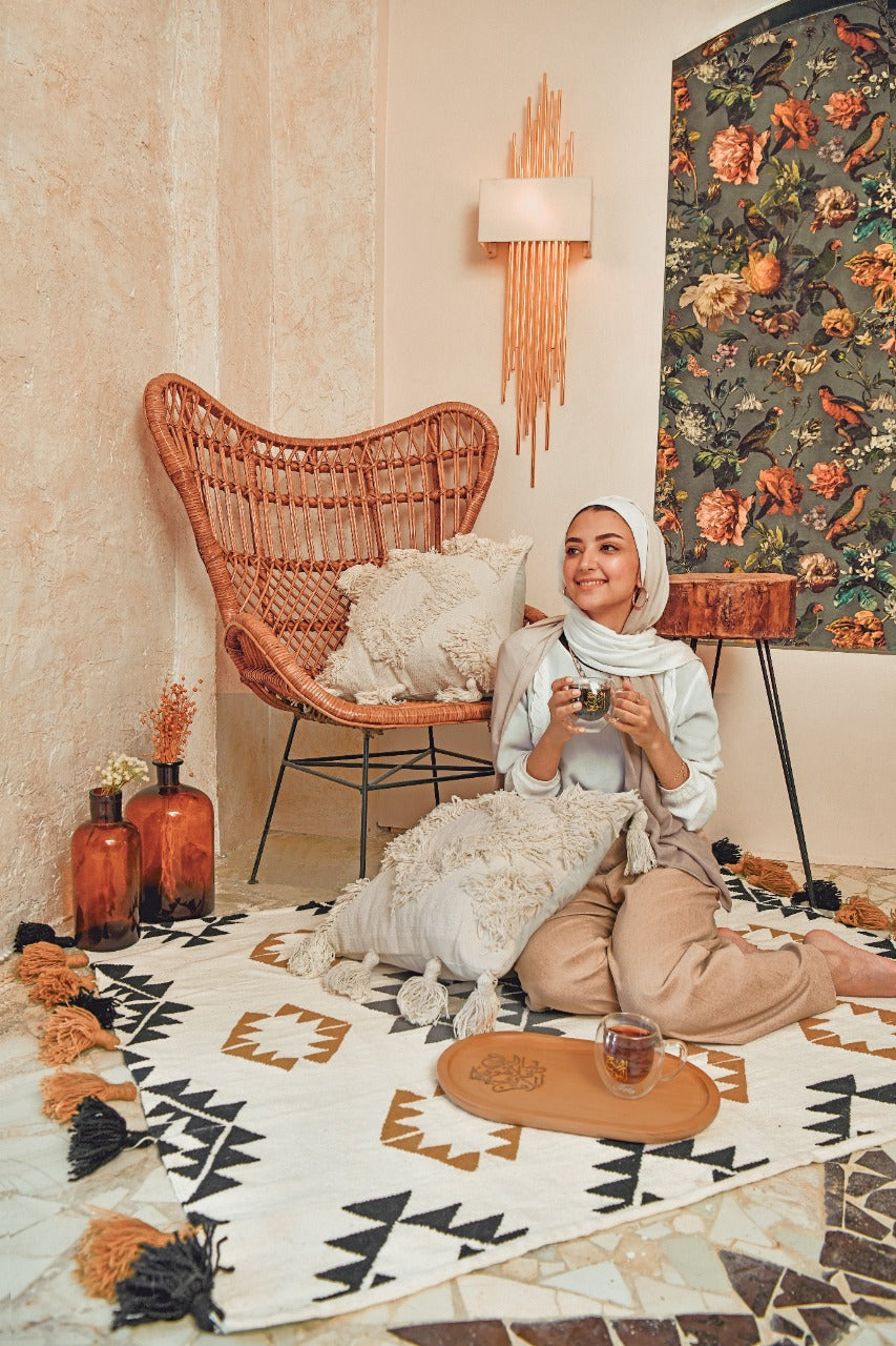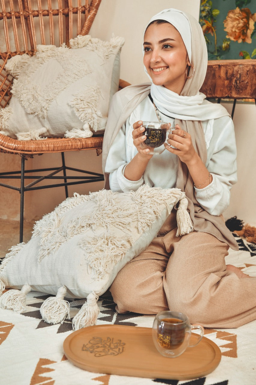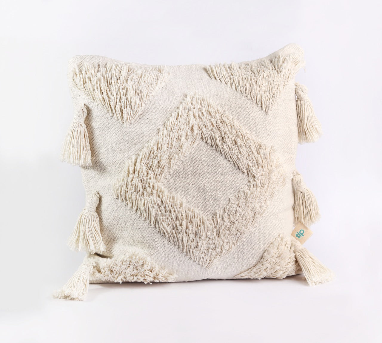 "ايفوري" غطاء خدادية مقاسها 50*50 مصنوعة يدويًا علي أرضية قطن ناعم ومريح، بتصميم بارز مزود بشراشيب