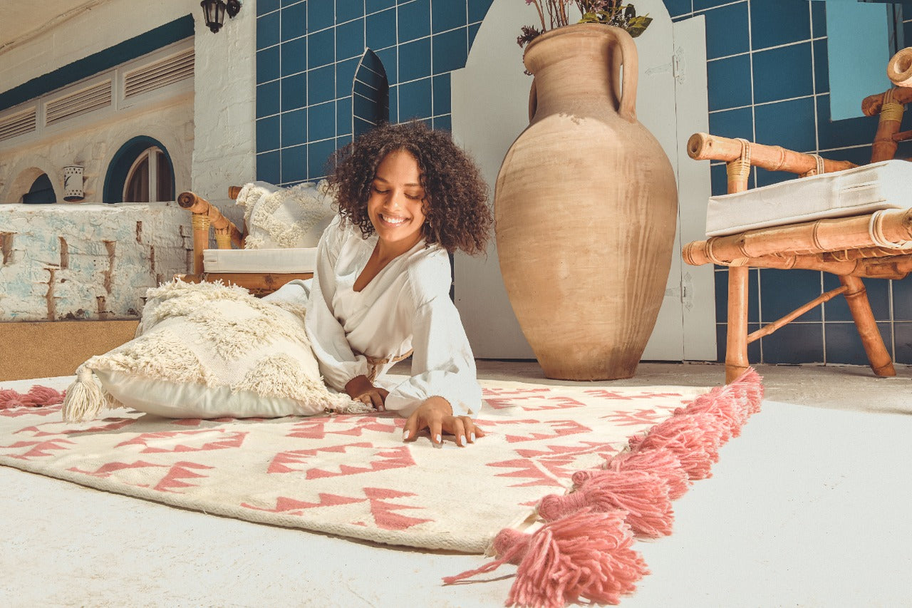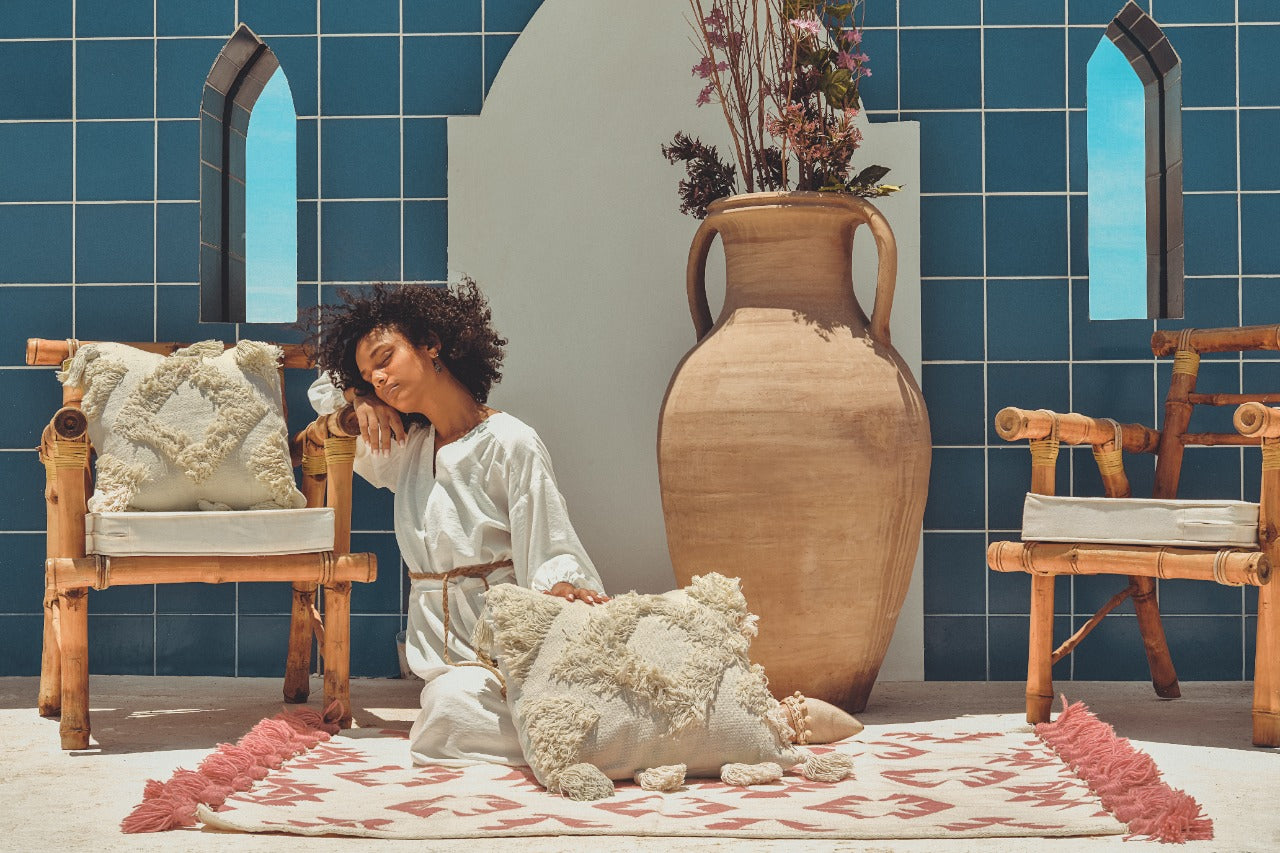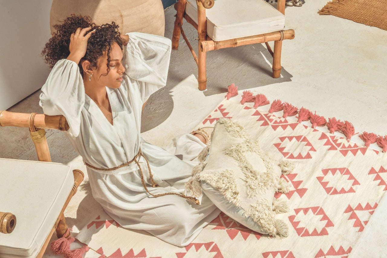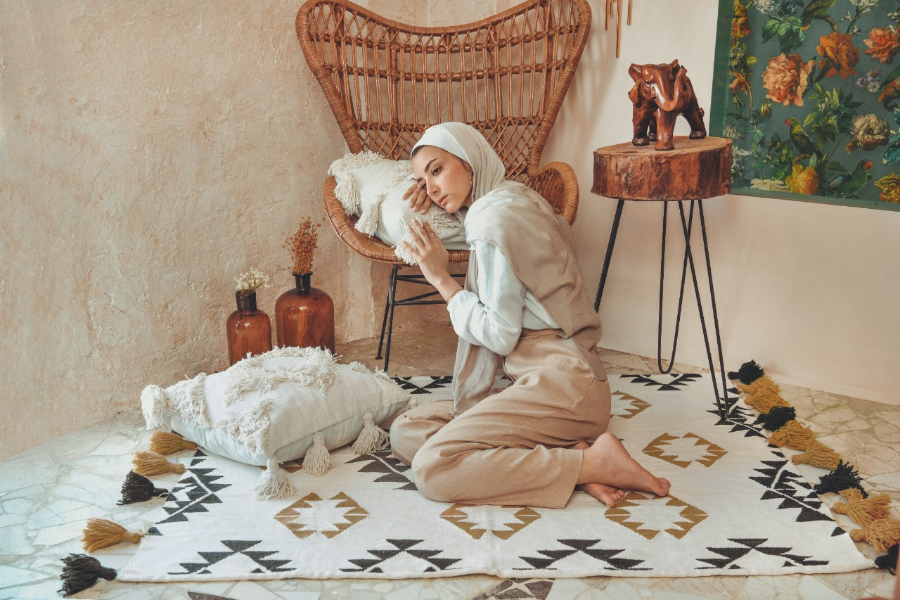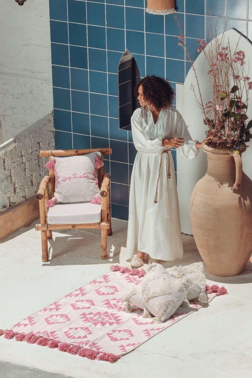 "ايفوري" غطاء خدادية مقاسها 50*50 مصنوعة يدويًا علي أرضية قطن ناعم ومريح، بتصميم بارز مزود بشراشيب