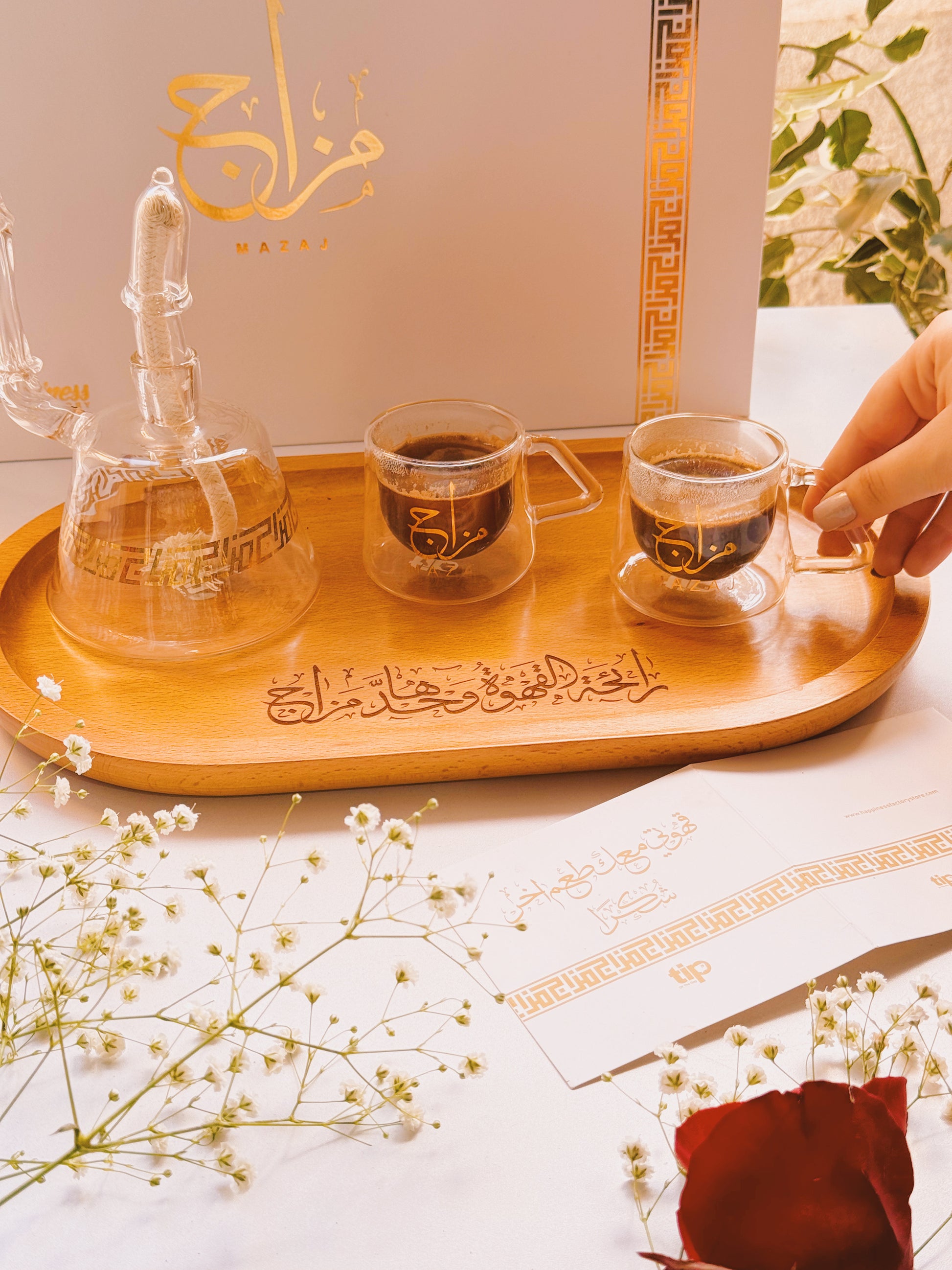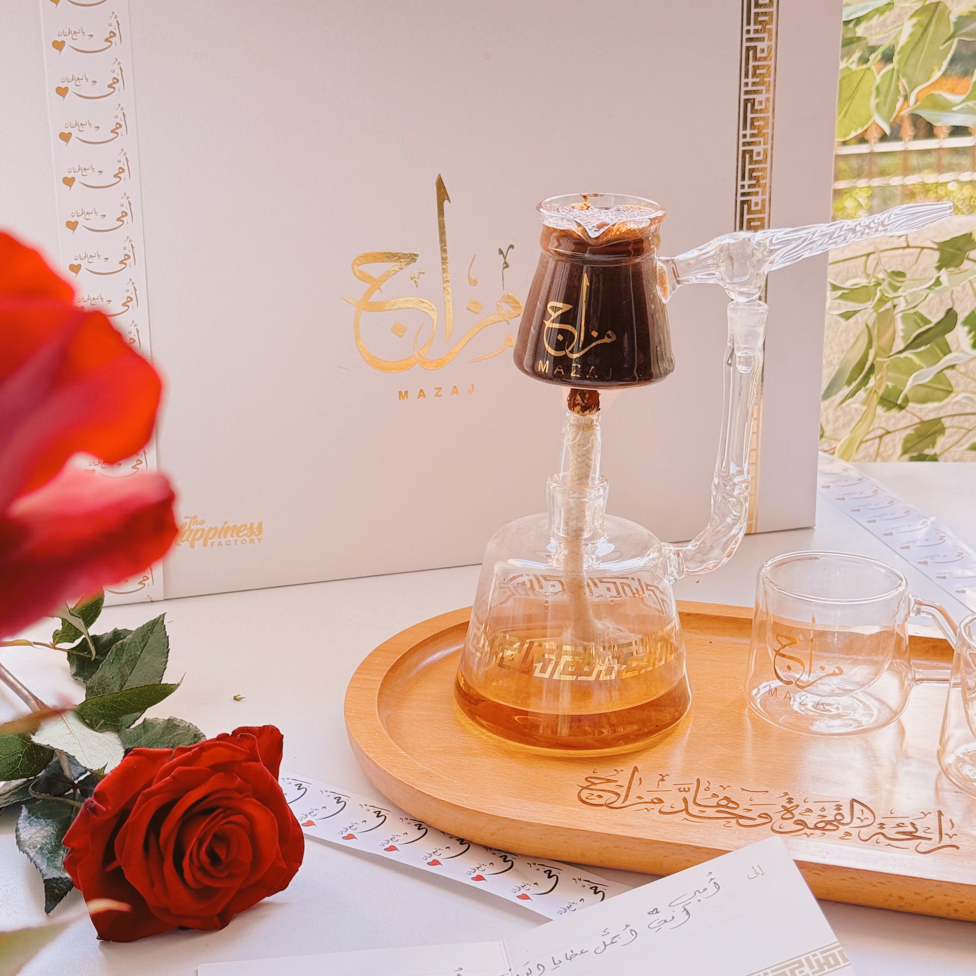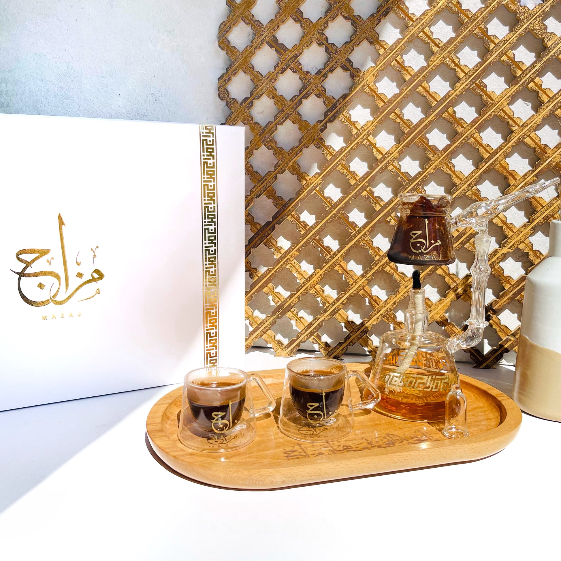 Mazaj is completely handmade in a pyrex glass with glided Arabic writing.