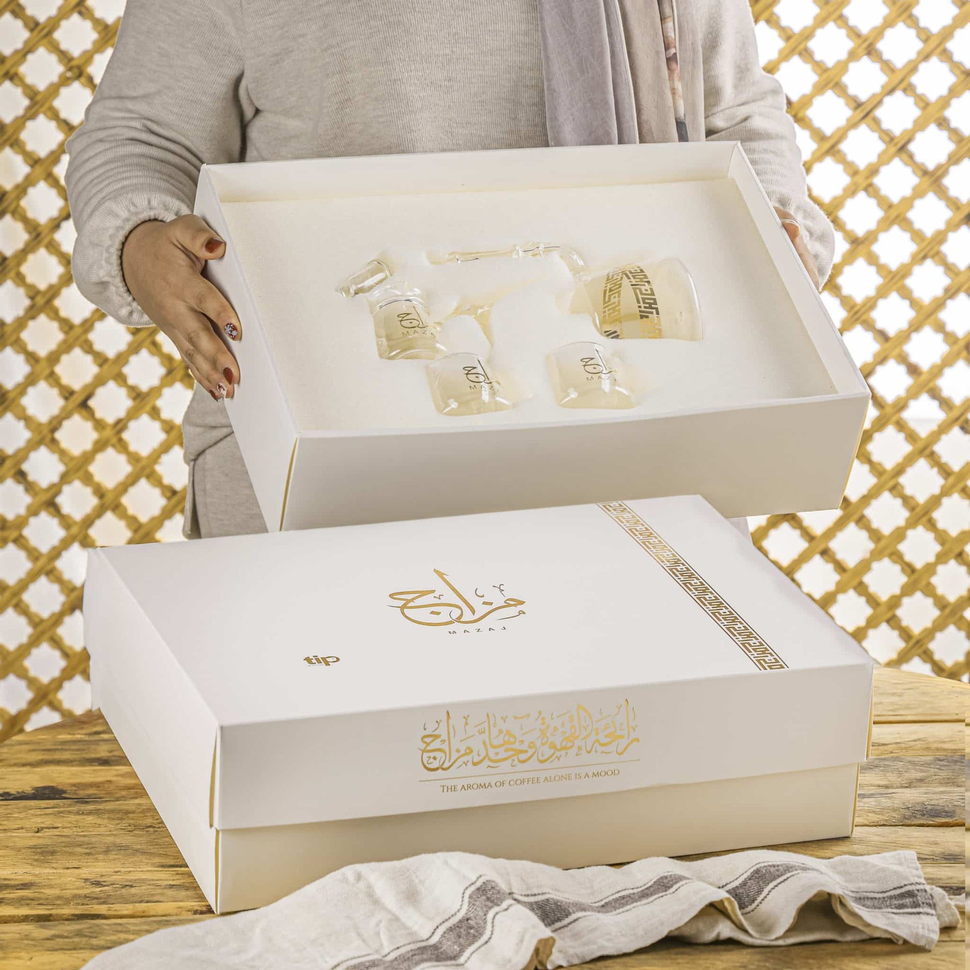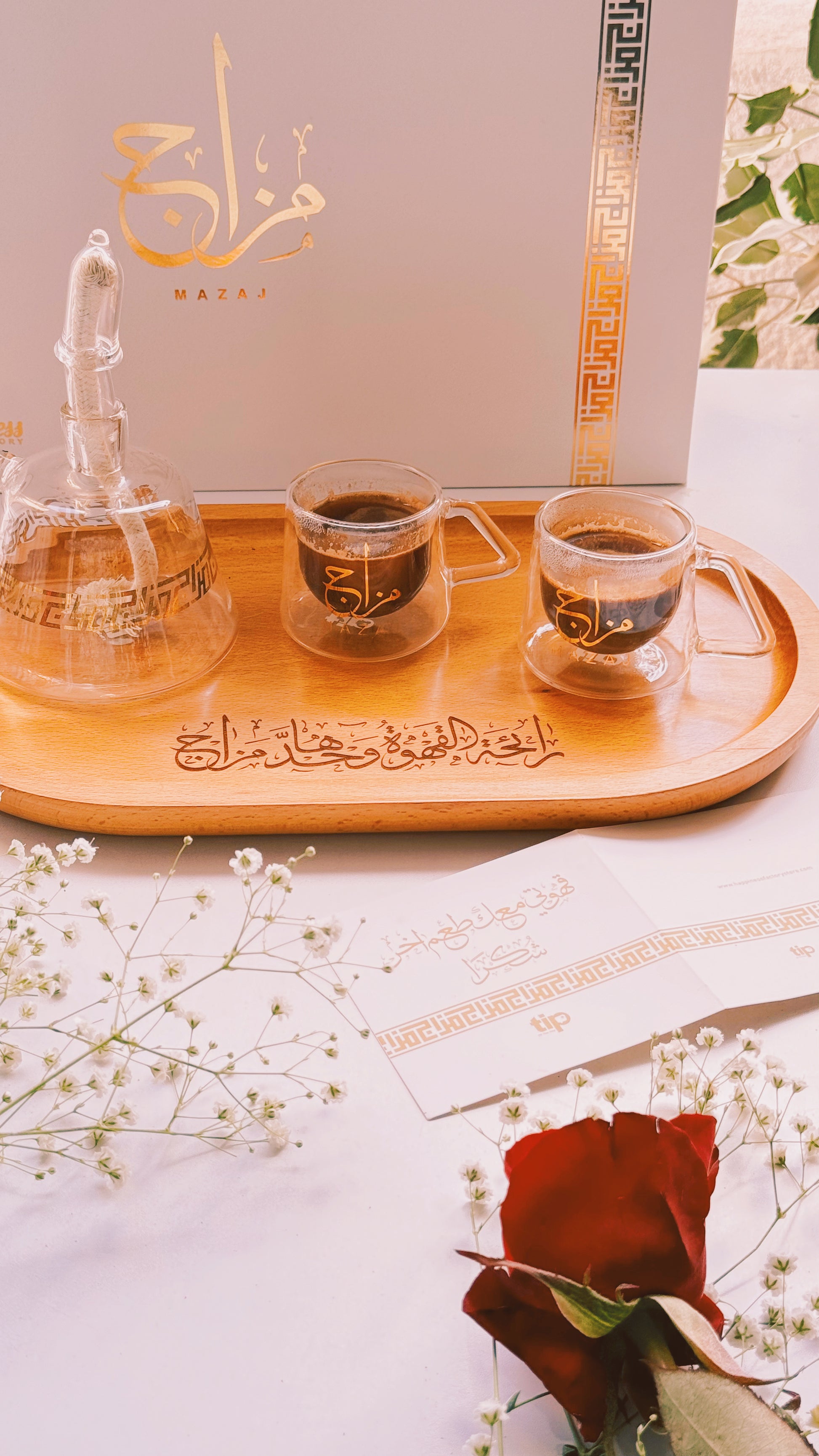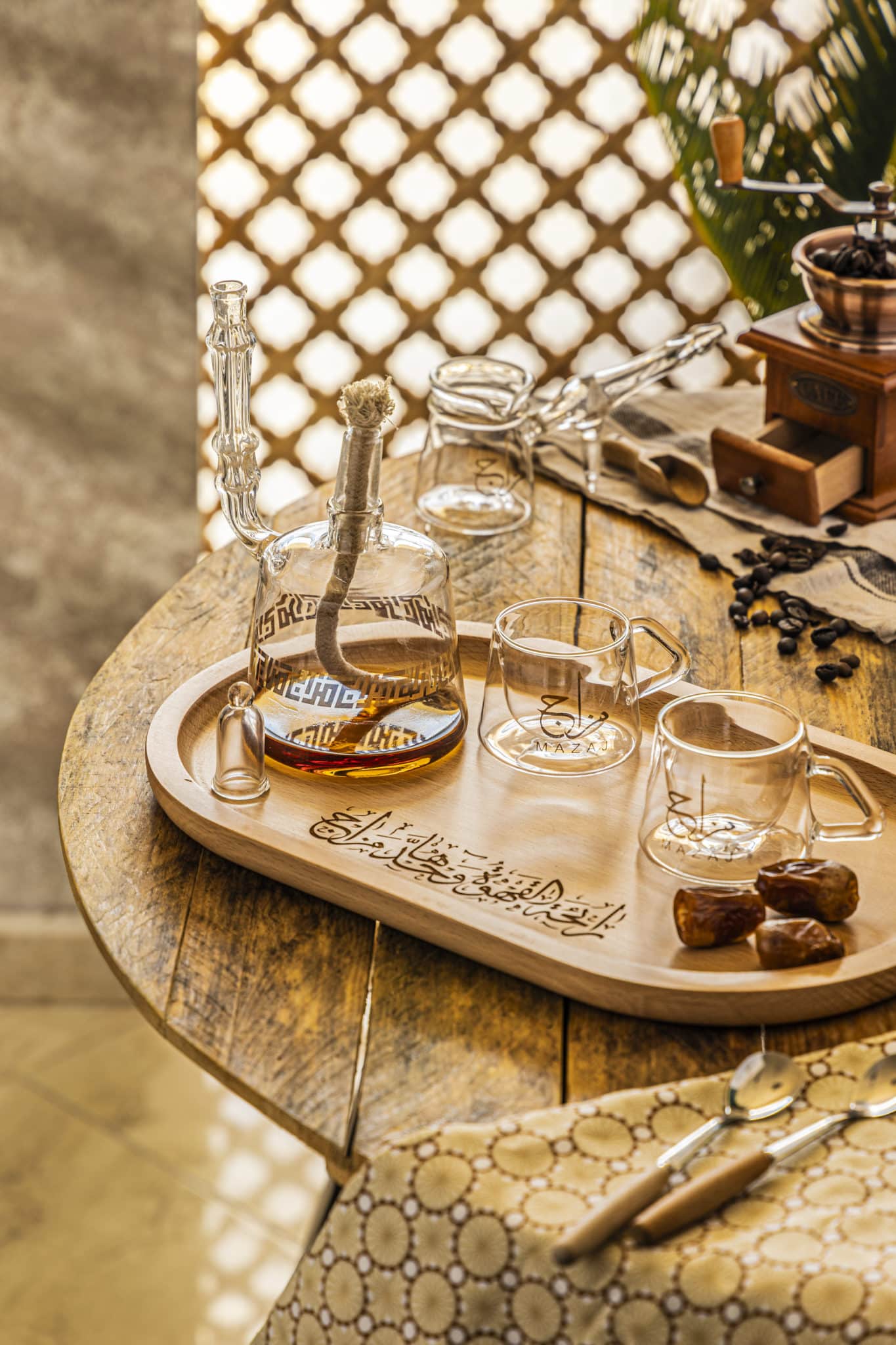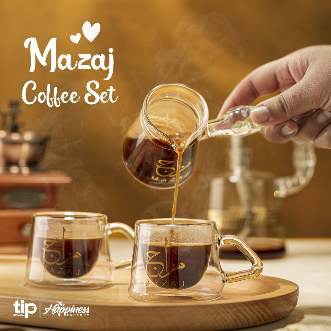 Mazaj is completely handmade in a pyrex glass with glided Arabic writing.