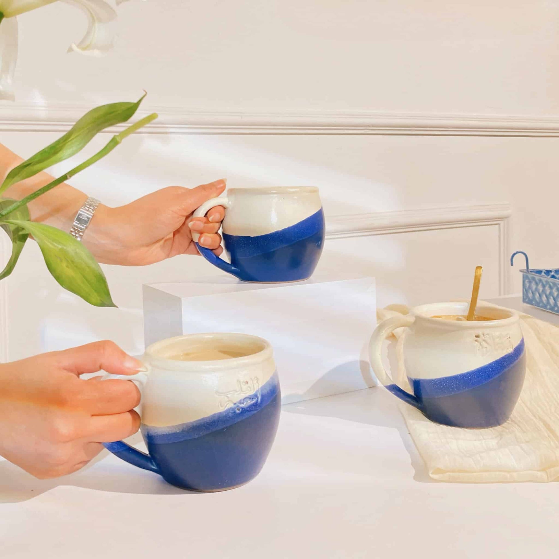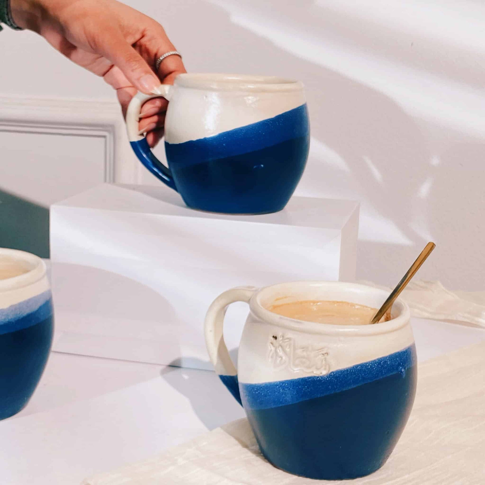 Enjoy your favorite drink in a mug handcrafted from corrugated pottery in white, blue and navy blue, engraved with the word “happiness” in Arabic.